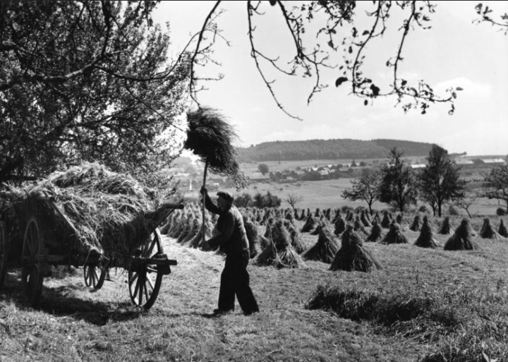 Vor dem Zweiten Weltkrieg und auch z.T. noch danach, wurden die im Bild zu sehenden Arbeiten auf den Getreidefeldern mit Pferden, und das Aufsetzten der Garben zu Hocken bzw. Hausten, meistens von Frauen geleistet. Der Autor schreibt aus eigenem Erleben.