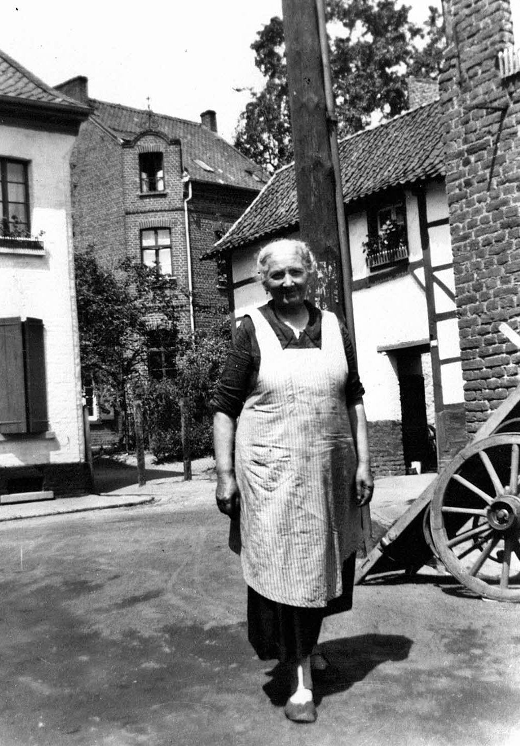 vor der Zerstörung des Wickrather Ortskerns: Bäckerei /Confiserie Josef Rombey; im Hofraum des Anwesens Frau Rombey mit ihrer Tochter Gertrud, nebenstehendes Foto, Frau Coenen eine gute Nachbarin. Sie ist die Mutter von Josef, genannt „Coenen Schwemm“. Er war in den 1970er Jahren im Auftrag des Wickrather Einzelhandels der Nikolaus, der Klein und Groß „een Kloosmännke“, einen Weckmann, schenkte. Durch seine Größe war er Respekt einflößend und manchmal stand ihm der Schalk im Nacken.