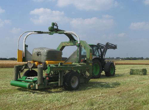 Das bereits gemähte Gras wird aufgesogen und zu Ballen gepresst. Die zweite Einheit nimmt die Ballen auf und ummantelt sie. Die auf dem Acker verstreuten Ballen werden durch einen Frontlader aufgeladen und auf ein Transportwagen verladen.